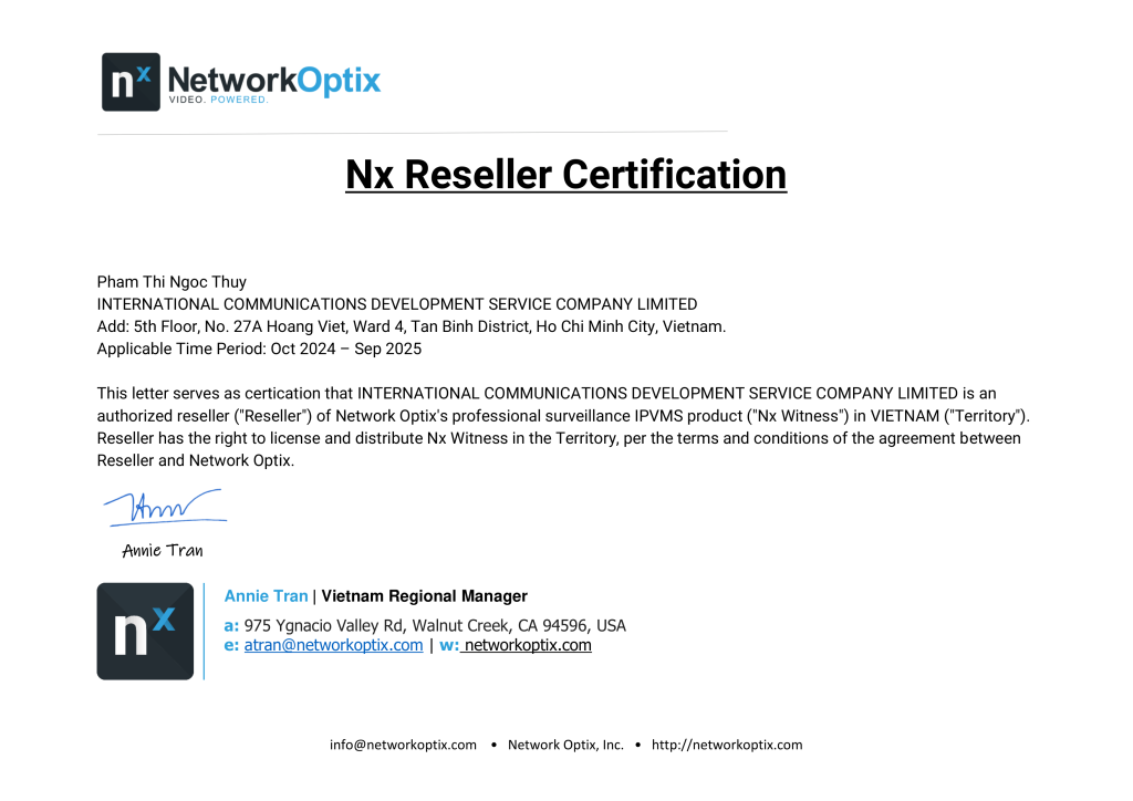 NX Optix chuyên cung cấp các giải pháp phần mềm quản lý video (VMS) và hệ thống camera giám sát thông minh, phục vụ nhu cầu an ninh từ quy mô nhỏ đến doanh nghiệp lớn. Các sản phẩm và giải pháp của NX Optix bao gồm phần mềm NX Witness VMS, hệ thống quản lý camera IP, giải pháp lưu trữ video và tích hợp AI thông minh — tất cả đều là phần mềm bản quyền chính hãng với đầy đủ giấy tờ hợp lệ, mang đến mức giá cạnh tranh nhất cho đại lý và người dùng cuối.