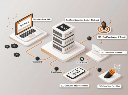ZendZone cung cấp các dịch vụ: Colocation (ZCO), Internet FTTX (ZFX), Leased Line, IP Transit (BGP), WAN MPLS và Dark Fiber.
